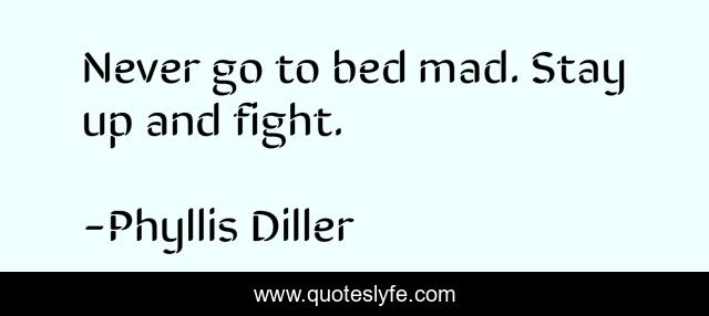 This page presents the quote "Never go to bed mad. Stay up and fight.". Author of this quote is Phyllis Diller. This quote is about anger, funny, comedy, sleep,.