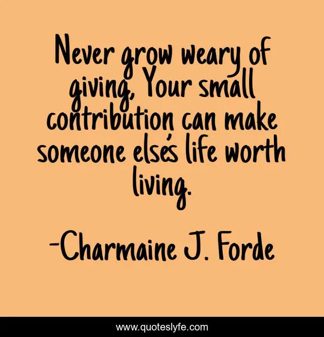 This page presents the quote "Never grow weary of giving, Your small contribution can make someone else’s life worth living.". Author of this quote is Charmaine J. Forde. This quote is about living, giving, weary, contribution, worth, someone-else-s-life,.