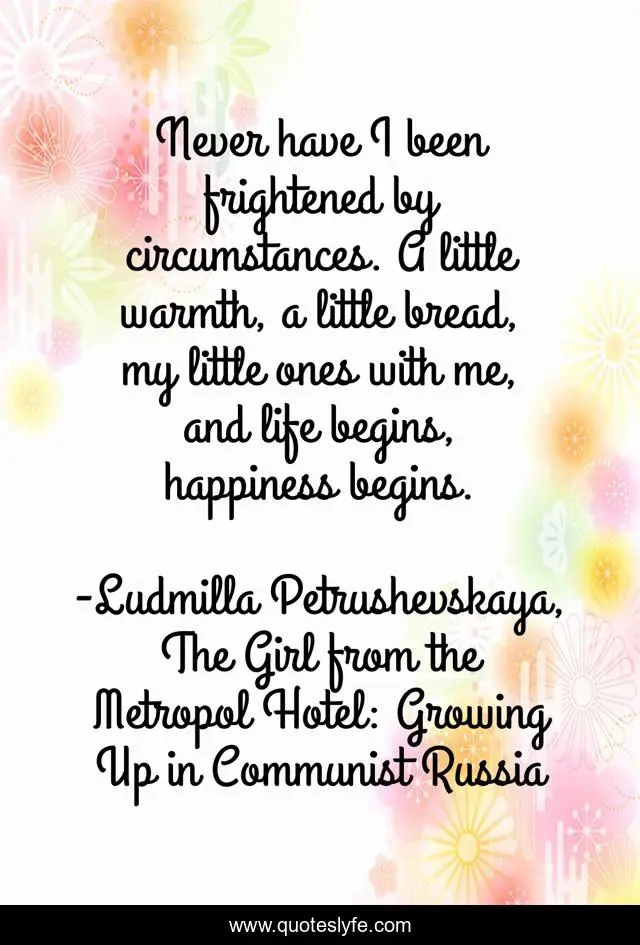 This page presents the quote "Never have I been frightened by circumstances. A little warmth, a little bread, my little ones with me, and life begins, happiness begins.". Author of this quote is Ludmilla Petrushevskaya, The Girl from the Metropol Hotel: Growing Up in Communist Russia. This quote is about simple-truths, life-philosophy, life, happiness,.
