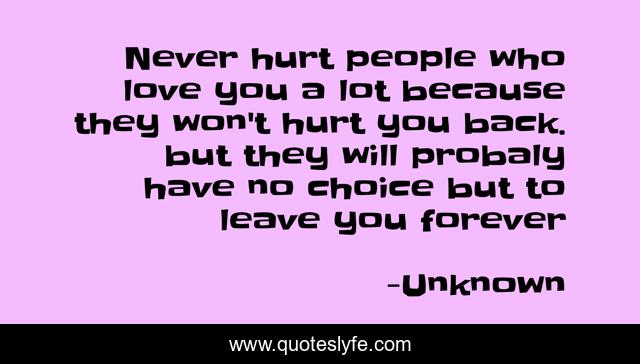 This page presents the quote "Never hurt people who love you a lot because they won't hurt you back. but they will probaly have no choice but to leave you forever". Author of this quote is Unknown. This quote is about never-hurt, leave-you, forever, no-choice, hurt-you-back,.