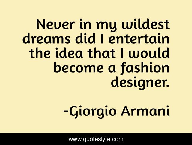 This page presents the quote "Never in my wildest dreams did I entertain the idea that I would become a fashion designer.". Author of this quote is Giorgio Armani. This quote is about fashion, idea,.