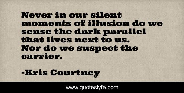 This page presents the quote "Never in our silent moments of illusion do we sense the dark parallel that lives next to us. Nor do we suspect the carrier.". Author of this quote is Kris Courtney. This quote is about kris-allen-courtney, book, norma-jean, memoir, parallel,.