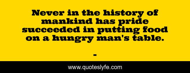 This page presents the quote "Never in the history of mankind has pride succeeded in putting food on a hungry man's table.". Author of this quote is . This quote is about a-hungry-man, edmond-mbiaka, the-history-of-mankind, having-too-much-pride, food-on-the-table, pride,.