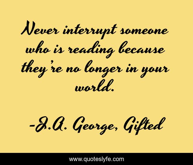 This page presents the quote "Never interrupt someone who is reading because they’re no longer in your world.". Author of this quote is J.A. George, Gifted. This quote is about books, reading,.