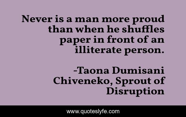 This page presents the quote "Never is a man more proud than when he shuffles paper in front of an illiterate person.". Author of this quote is Taona Dumisani Chiveneko, Sprout of Disruption. This quote is about zimbabwe, africa, paranormal-romancesuspense, thriller, mystrey,.