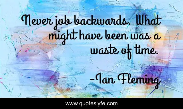 This page presents the quote "Never job backwards. What might have been was a waste of time.". Author of this quote is Ian Fleming. This quote is about life, inspirational, time, enthusiasm, no-regrets, now, present,.