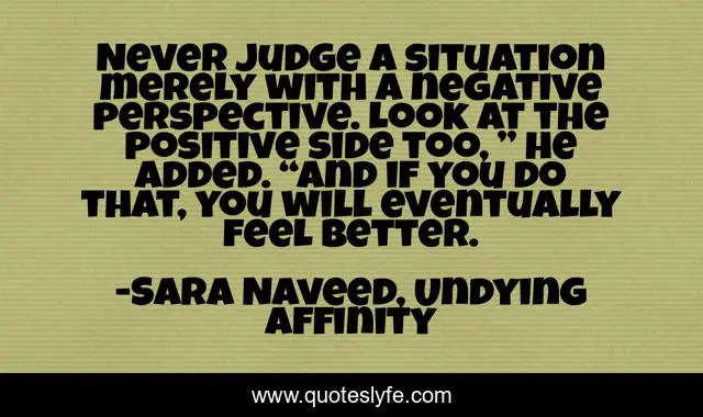 This page presents the quote "Never judge a situation merely with a negative perspective. Look at the positive side too, ” he added. “And if you do that, you will eventually feel better.". Author of this quote is Sara Naveed, Undying Affinity. This quote is about motivation, romancebook, love, relationship, lovestory, romance, romancenovel, lifelessons, saranaveed,.