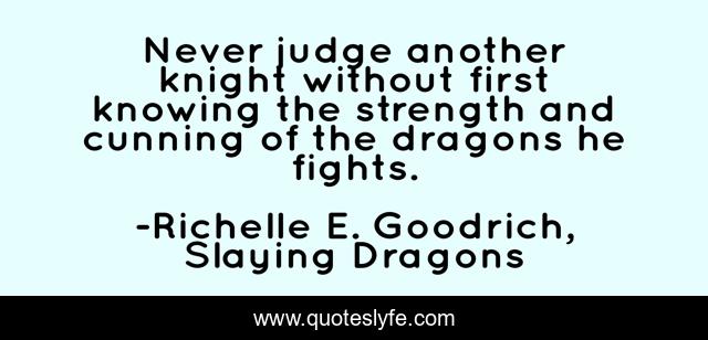This page presents the quote "Never judge another knight without first knowing the strength and cunning of the dragons he fights.". Author of this quote is Richelle E. Goodrich, Slaying Dragons. This quote is about richelle-e-goodrich, slaying-dragons, dragons, good-judgment, richelle, judging, judge, richelle-goodrich, judging-others,.