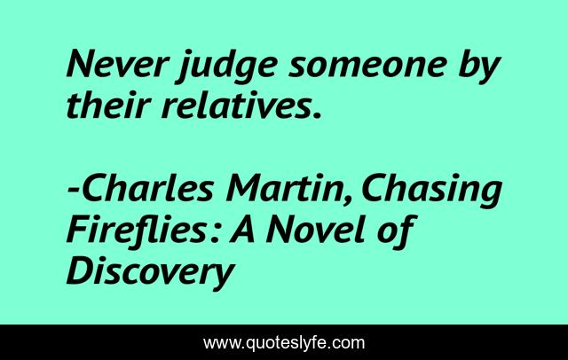 This page presents the quote "Never judge someone by their relatives.". Author of this quote is Charles Martin, Chasing Fireflies: A Novel of Discovery. This quote is about deceit, relationships, past-history, family,.