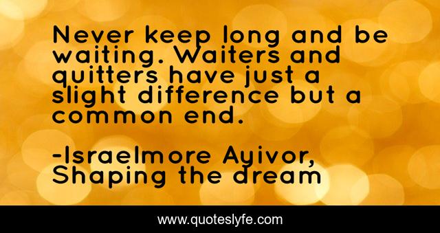 This page presents the quote "Never keep long and be waiting. Waiters and quitters have just a slight difference but a common end.". Author of this quote is Israelmore Ayivor, Shaping the dream. This quote is about very-long, quit, differ, difference, end, food-for-thought, long, different, quitters,.