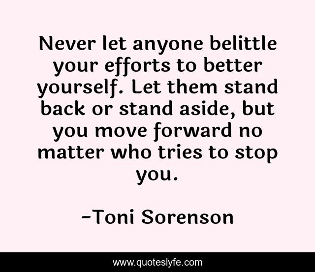 This page presents the quote "Never let anyone belittle your efforts to better yourself. Let them stand back or stand aside, but you move forward no matter who tries to stop you.". Author of this quote is Toni Sorenson. This quote is about thinking, brain, life, self-improvement, thoughts,.