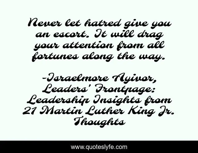 This page presents the quote "Never let hatred give you an escort. It will drag your attention from all fortunes along the way.". Author of this quote is Israelmore Ayivor, Leaders' Frontpage: Leadership Insights from 21 Martin Luther King Jr. Thoughts. This quote is about love, leaders, martin-luther-king, fortunes, laurel, hate, food-for-thought, martin-luther-king-jr, way,.