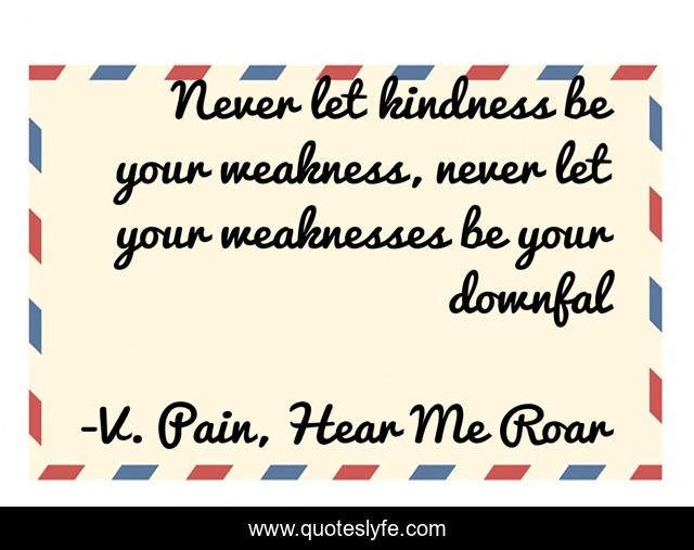 This page presents the quote "Never let kindness be your weakness, never let your weaknesses be your downfal". Author of this quote is V. Pain, Hear Me Roar. This quote is about strength, hear-me-roar, vpain, abuse, healing, inspiration,.