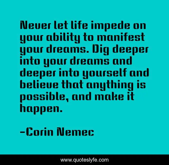 This page presents the quote "Never let life impede on your ability to manifest your dreams. Dig deeper into your dreams and deeper into yourself and believe that anything is possible, and make it happen.". Author of this quote is Corin Nemec. This quote is about life, believe, yourself,.