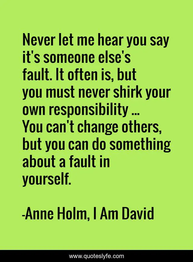This page presents the quote "Never let me hear you say it's someone else's fault. It often is, but you must never shirk your own responsibility ... You can't change others, but you can do something about a fault in yourself.". Author of this quote is Anne Holm, I Am David. This quote is about fault, responsibility,.