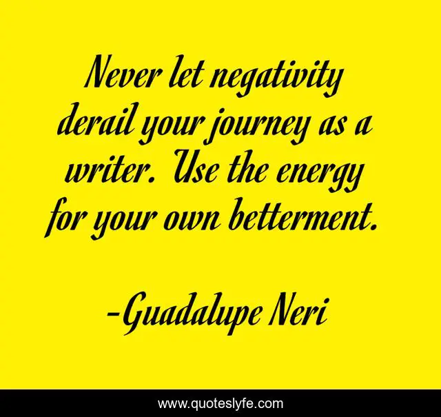 This page presents the quote "Never let negativity derail your journey as a writer. Use the energy for your own betterment.". Author of this quote is Guadalupe Neri. This quote is about inspiration, writing,.
