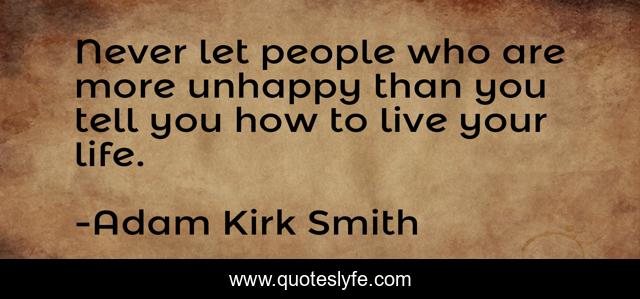 This page presents the quote "Never let people who are more unhappy than you tell you how to live your life.". Author of this quote is Adam Kirk Smith. This quote is about happy-life, happiness, happy,.