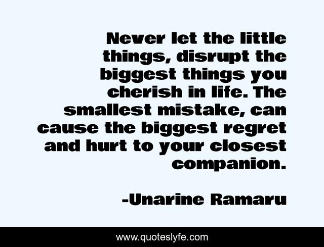 This page presents the quote "Never let the little things, disrupt the biggest things you cherish in life. The smallest mistake, can cause the biggest regret and hurt to your closest companion.". Author of this quote is Unarine Ramaru. This quote is about life, love, regret, relationship, companion, mistakes, devotion, cherish, affection,.