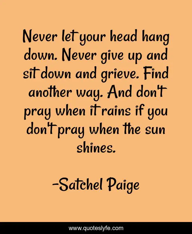 This page presents the quote "Never let your head hang down. Never give up and sit down and grieve. Find another way. And don't pray when it rains if you don't pray when the sun shines.". Author of this quote is Satchel Paige. This quote is about courage, bravery,.