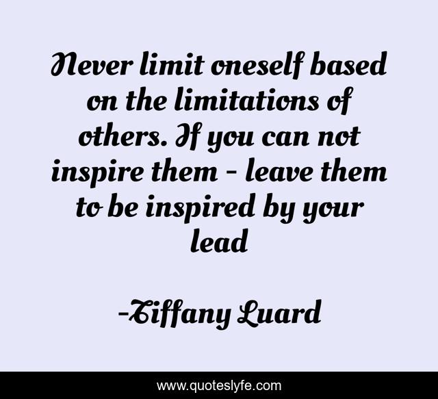 This page presents the quote "Never limit oneself based on the limitations of others. If you can not inspire them - leave them to be inspired by your lead". Author of this quote is Tiffany Luard. This quote is about development, inspiring-words, deligent, elevation, inspire, thinking, forgiveness, limitless, life,.
