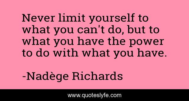 This page presents the quote "Never limit yourself to what you can't do, but to what you have the power to do with what you have.". Author of this quote is Nadège Richards. This quote is about limitations, life, love, power, stand-out, empowerment, stength, stand-up, affection,.