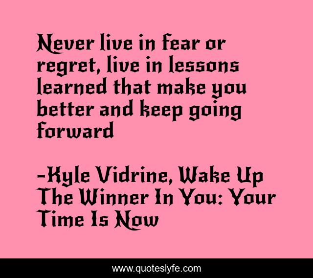 This page presents the quote "Never live in fear or regret, live in lessons learned that make you better and keep going forward". Author of this quote is Kyle Vidrine, Wake Up The Winner In You: Your Time Is Now. This quote is about motivation, kyle-vidrine, personal-growth, positive, motivational, confidence, kyle-the-dream-vidrine, inspirational, self-help,.
