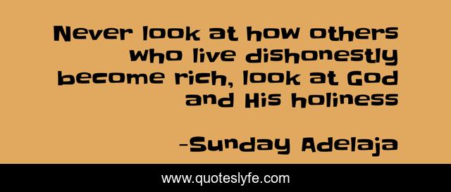 This page presents the quote "Never look at how others who live dishonestly become rich, look at God and His holiness". Author of this quote is Sunday Adelaja. This quote is about prosperity, reality-of-life, dishonestly, self-confidence, look, holiness, god, riches, live,.