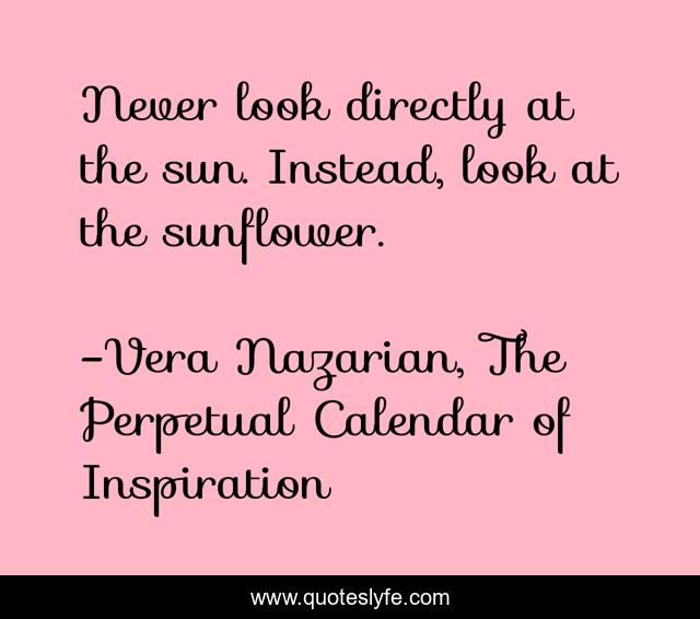 "Vera Nazarian, The Perpetual Calendar of Inspiration Quotes." Quoteslyfe.com, 2025. Mon. 08 Dec. 2025. <https://www.quoteslyfe.com/quote/Never-look-directly-at-the-sun-Instead-197333>.