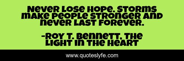 "Roy T. Bennett, The Light in the Heart Quotes." Quoteslyfe.com, 2025. Mon. 08 Dec. 2025. <https://www.quoteslyfe.com/quote/Never-lose-hope-Storms-make-people-stronger-2134>.