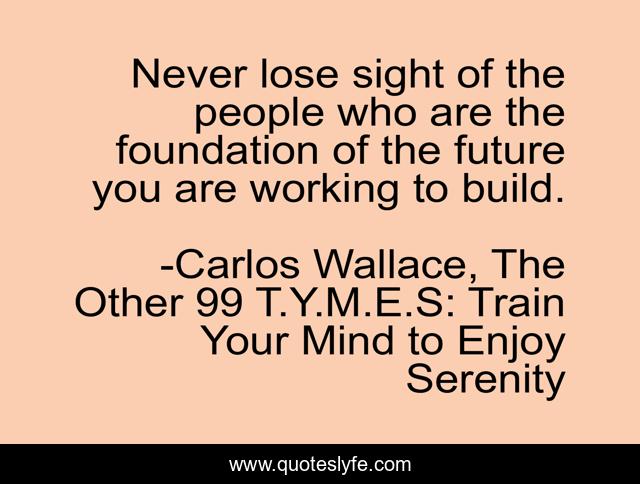 This page presents the quote "Never lose sight of the people who are the foundation of the future you are working to build.". Author of this quote is Carlos Wallace, The Other 99 T.Y.M.E.S: Train Your Mind to Enjoy Serenity. This quote is about family, focus-on-your-dreams, carlos-wallace, focus-on-positive, focus-on-success, family-life, focusing, family-relationships,.