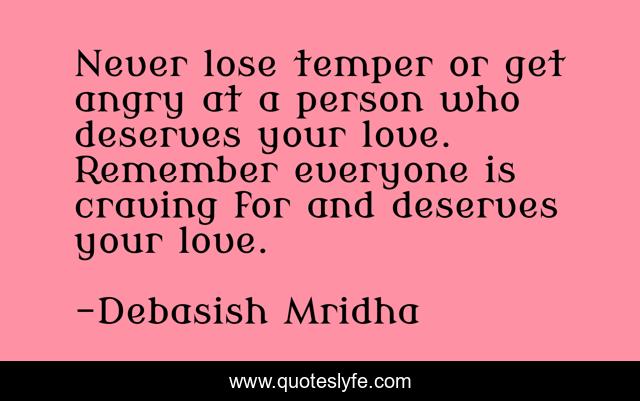 This page presents the quote "Never lose temper or get angry at a person who deserves your love. Remember everyone is craving for and deserves your love.". Author of this quote is Debasish Mridha. This quote is about life, love, knowledge, inspirational, intelligence, philosophy, wisdom, quotes, affection,.