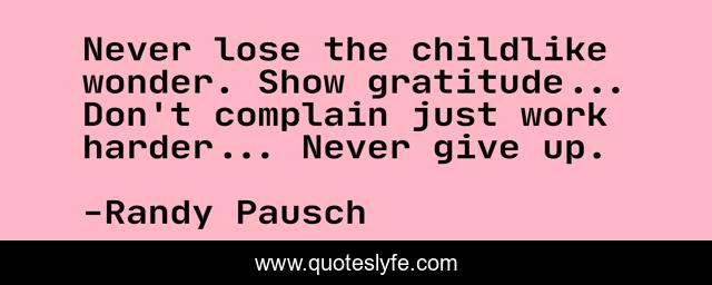 This page presents the quote "Never lose the childlike wonder. Show gratitude... Don't complain just work harder... Never give up.". Author of this quote is Randy Pausch. This quote is about gratitude, never give up,.