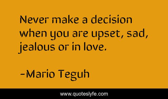 This page presents the quote "Never make a decision when you are upset, sad, jealous or in love.". Author of this quote is Mario Teguh. This quote is about jealous, decision, sad,.