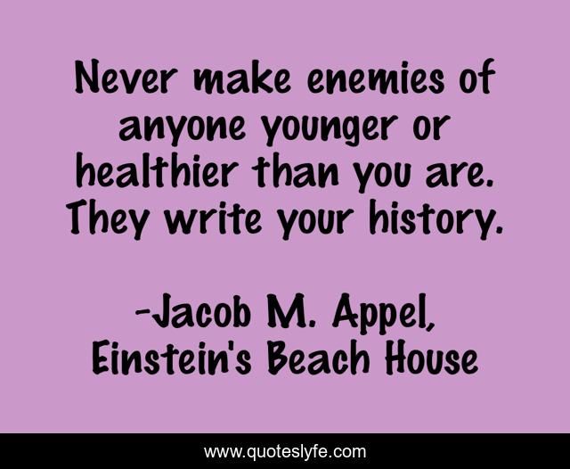 This page presents the quote "Never make enemies of anyone younger or healthier than you are. They write your history.". Author of this quote is Jacob M. Appel, Einstein's Beach House. This quote is about younger, advice, youth, history, advice-for-daily-living, friends, age, enemies,.