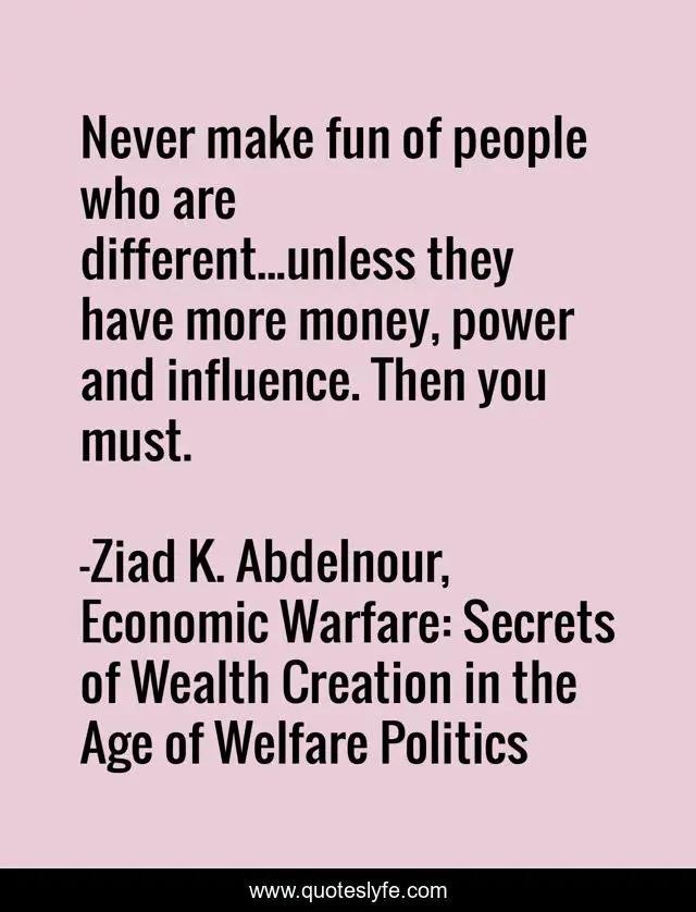 This page presents the quote "Never make fun of people who are different...unless they have more money, power and influence. Then you must.". Author of this quote is Ziad K. Abdelnour, Economic Warfare: Secrets of Wealth Creation in the Age of Welfare Politics. This quote is about fun, money, influence, power,.