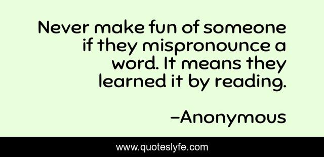 This page presents the quote "Never make fun of someone if they mispronounce a word. It means they learned it by reading.". Author of this quote is Anonymous. This quote is about reading, mispronounce,.