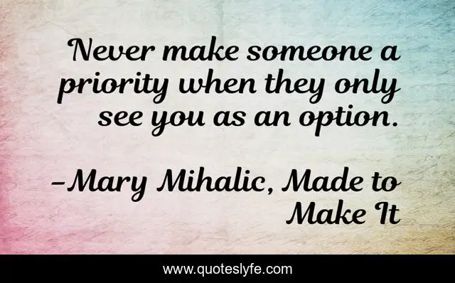 This page presents the quote "Never make someone a priority when they only see you as an option.". Author of this quote is Mary Mihalic, Made to Make It. This quote is about confidence, positive, motivational, growth, optimistic, inspirational, self-help, enthusiasm,.