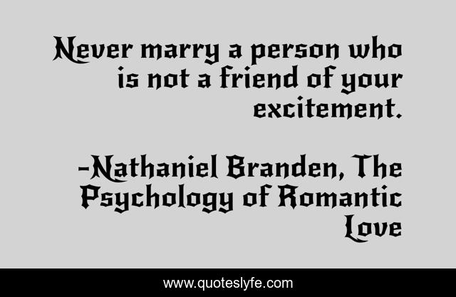This page presents the quote "Never marry a person who is not a friend of your excitement.". Author of this quote is Nathaniel Branden, The Psychology of Romantic Love. This quote is about love, marriage-advice, excitement, marriage, passion, affection,.