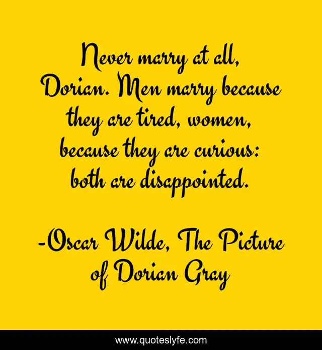 "Oscar Wilde, The Picture of Dorian Gray Quotes." Quoteslyfe.com, 2025. Sat. 06 Dec. 2025. <https://www.quoteslyfe.com/quote/Never-marry-at-all-Dorian-Men-marry-34713>.