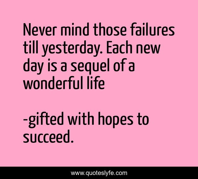 This page presents the quote "Never mind those failures till yesterday. Each new day is a sequel of a wonderful life". Author of this quote is gifted with hopes to succeed.. .