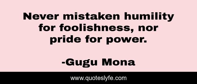 This page presents the quote "Never mistaken humility for foolishness, nor pride for power.". Author of this quote is Gugu Mona. This quote is about foolishness, pride, mistaken, power, humility,.