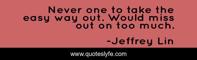 This page presents the quote "Never one to take the easy way out. Would miss out on too much.". Author of this quote is Jeffrey Lin. This quote is about life-philosophy, life-and-living, self-improvement, success,.