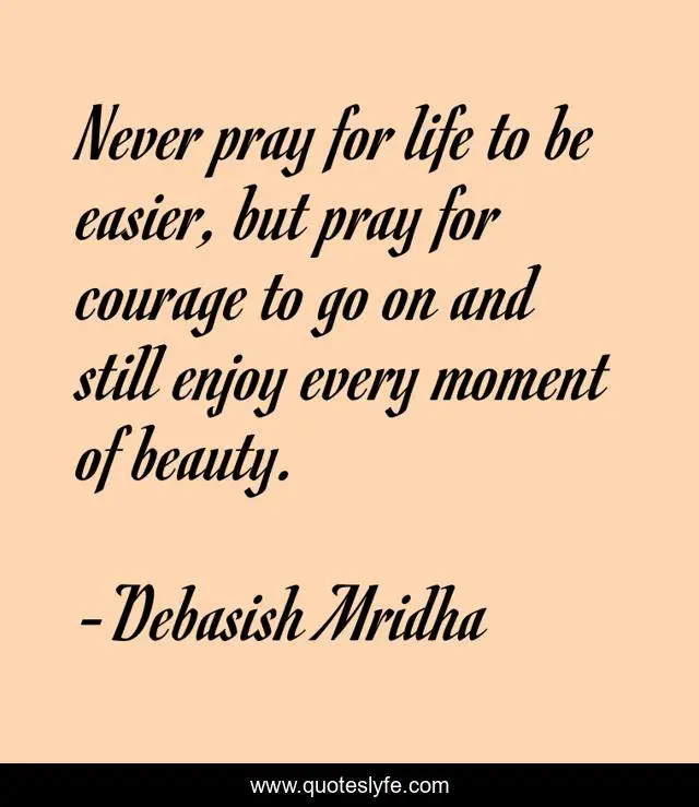 This page presents the quote "Never pray for life to be easier, but pray for courage to go on and still enjoy every moment of beauty.". Author of this quote is Debasish Mridha. This quote is about philosophy, debasish-mridha, quotes, pray-for-life, inspirational, pray-for-courage, enthusiasm, enjoy-beauty, debasish-mridha-m-d,.