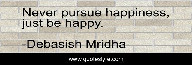 This page presents the quote "Never pursue happiness, just be happy.". Author of this quote is Debasish Mridha. This quote is about happy, life, love, knowledge, inspirational, intelligence, philosophy, wisdom, affection,.