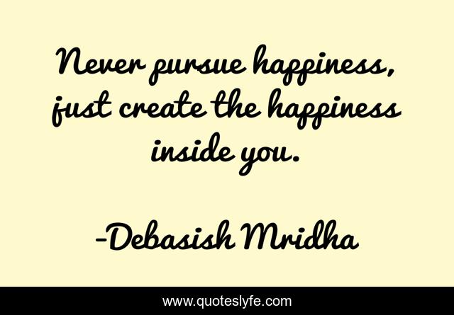 This page presents the quote "Never pursue happiness, just create the happiness inside you.". Author of this quote is Debasish Mridha. This quote is about life, love, knowledge, pursue, intelligence, create, philosophy, wisdom, inspirational,.