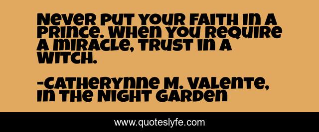 This page presents the quote "Never put your faith in a Prince. When you require a miracle, trust in a Witch.". Author of this quote is Catherynne M. Valente, In the Night Garden. This quote is about miracles, princes, witches,.