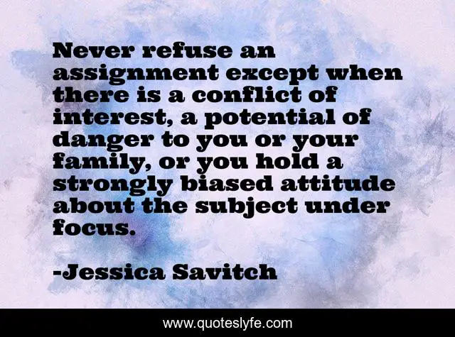 This page presents the quote "Never refuse an assignment except when there is a conflict of interest, a potential of danger to you or your family, or you hold a strongly biased attitude about the subject under focus.". Author of this quote is Jessica Savitch. This quote is about focus, family, conflict,.