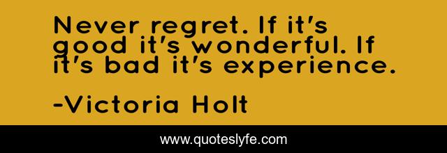 This page presents the quote "Never regret. If it's good it's wonderful. If it's bad it's experience.". Author of this quote is Victoria Holt. .