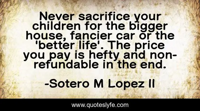 This page presents the quote "Never sacrifice your children for the bigger house, fancier car or the 'better life'. The price you pay is hefty and non-refundable in the end.". Author of this quote is Sotero M Lopez II. This quote is about family-relationships, kids, children, priorities, family,.