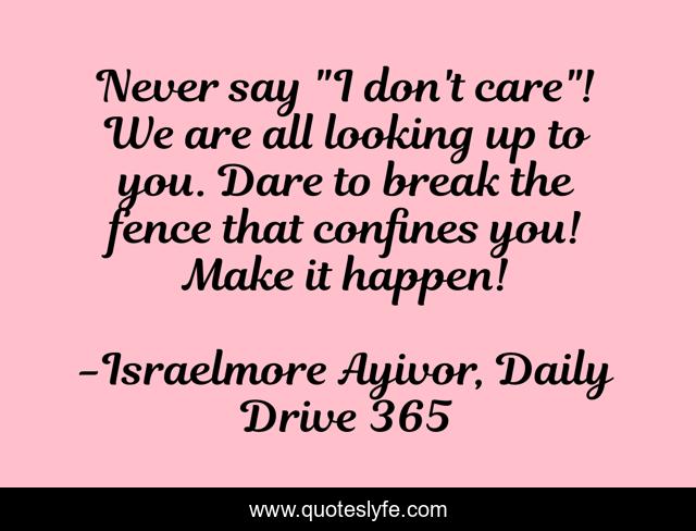 This page presents the quote "Never say "I don't care"! We are all looking up to you. Dare to break the fence that confines you! Make it happen!". Author of this quote is Israelmore Ayivor, Daily Drive 365. This quote is about i-don-t-care, food-for-thought, make-it-happen, take-care, break-the-fence, confinement, don-t-give-up, comfort-zone, israelmore-ayivor,.
